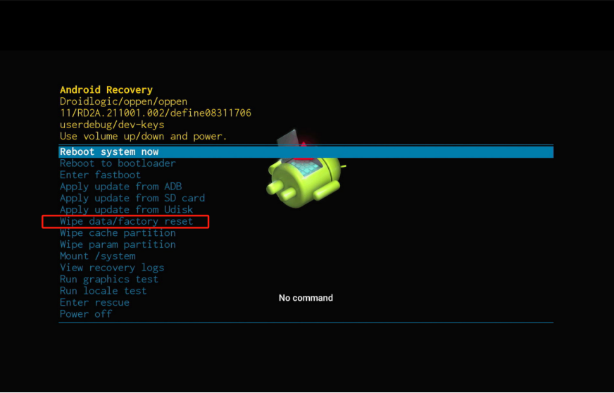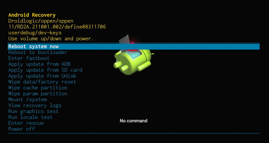 3、When the screen displays the boot logo (the first frame), release the pin and wait for twenty seconds. The box will enter Android Recovery. (If it gets stuck here, unplug the power and start the process over.)