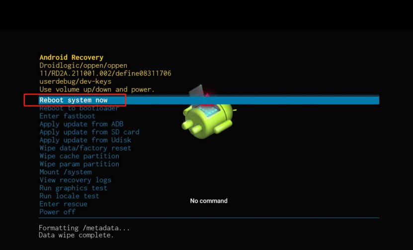 8、Once the reset is complete, it will return to Android Recovery. Select Reboot system now.
